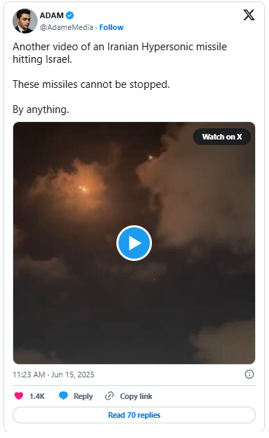 The suggestion that Iran is anywhere close to being "on its knees" seems fanciful, considering Iran has launched multiple missile barrages, the effects of which have significantly exceeded expectations. Two dozen Israelis have been killed and at least 400 injured, with the country also enduring major hits to government buildings, apartment towers and power plants. The starring role in those barrages has been played by Iran's highly advanced hypersonic missiles -- a weapon that neither Israel nor even the United States has in its arsenal:
