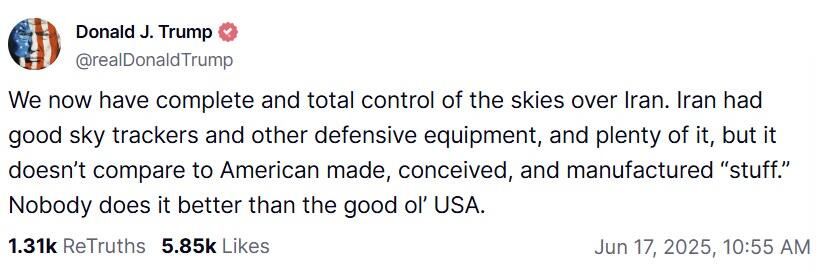 TRUMP SAYS 'WE' NOW HAVE 'TOTAL CONTROL' OF SKIES OVER IRAN