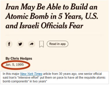 The unnamed official's rhetorical question about whether there's "any amount of enrichment" the US would allow may offer a glimmer of hope for an end to the Israel-initiated war. Iran sees enrichment as a right it possesses as a sovereign state, and has repeatedly said an outright ban on enrichment is completely out of the question. Iran has long been under a religious order, or "fatwa," forbidding the development of any weapon of mass destruction, and the country has long assured the world that it has no intention of building a nuclear weapon -- an assurance the US intelligence community validated in 2007 and has repeatedly re-confirmed since then -- most recently, just this March. Meanwhile, anti-Iran hawks have been warning of an imminent Iranian nuclear bomb for more than three decades:
